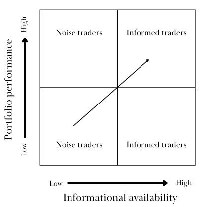 Second, and closely related, is the efficiency and performance of portfolios by informed and noise traders. If information is in the phase of being asymmetric or insufficient a portfolio could still perform well, it is either a matter of skill or luck. Many retail traders overestimate their own capabilities resulting in high loss ratios. However, if they belong to the few that do perform well their cognitive biases will be confirmed possibly leading to more trades with larger variances. As bias-driven portfolios tend to have larger variances, one could ask if irrationality needs to be compensated.