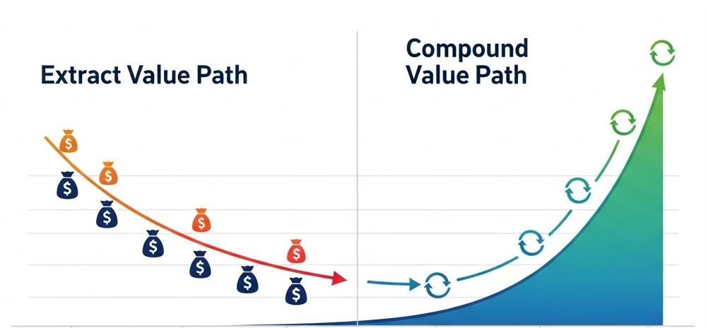This leads to the extraction trap: founders who built valuable businesses but think like employees about capital allocation, treating profits as personal rewards rather than fuel for compound growth.