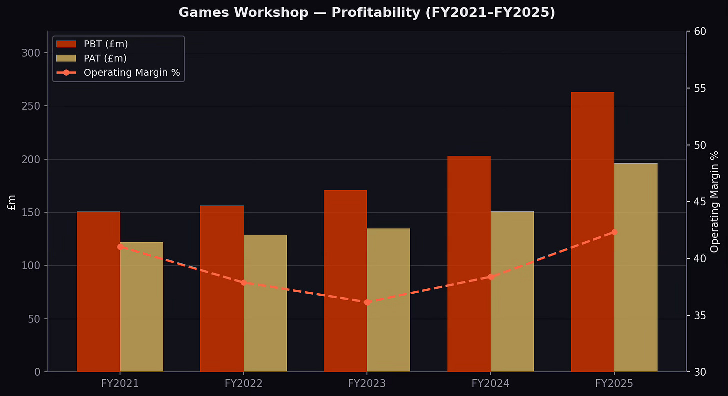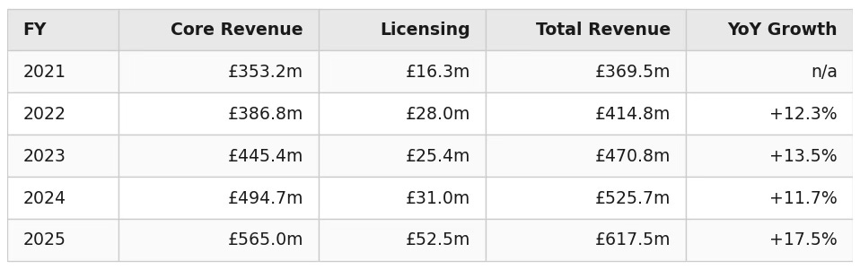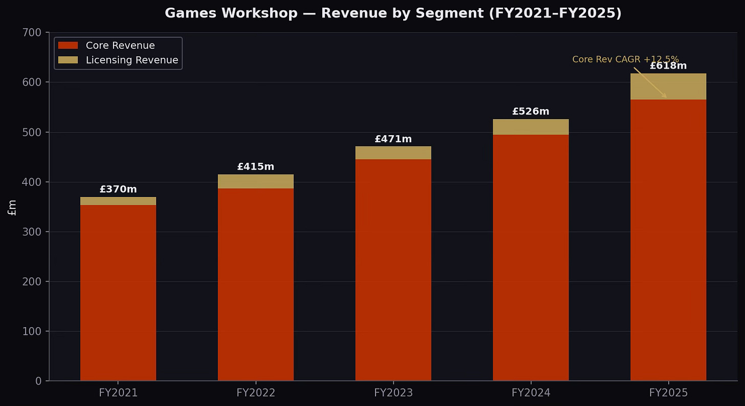 Core revenue has grown at a 12.5% CAGR over five years, with no year of decline. The licensing surge in FY2025 (+69% to 52.5m GBP) was driven primarily by the extraordinary commercial success of Space Marine 2, launched in September 2024. The core business is the compounding engine; licensing is welcome upside, but it is also volatile and should be modelled separately.