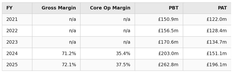 The 37.5% core operating margin in FY2025 is a five-year high, achieved on a cost base held largely stable relative to revenue. Operating expenses rose only 11.0m GBP year-on-year on a revenue increase of 91.8m GBP. Gross margin expansion (+90bps to 72.1%) reflects manufacturing efficiency gains, lower commodity costs and a favourable channel/product mix.