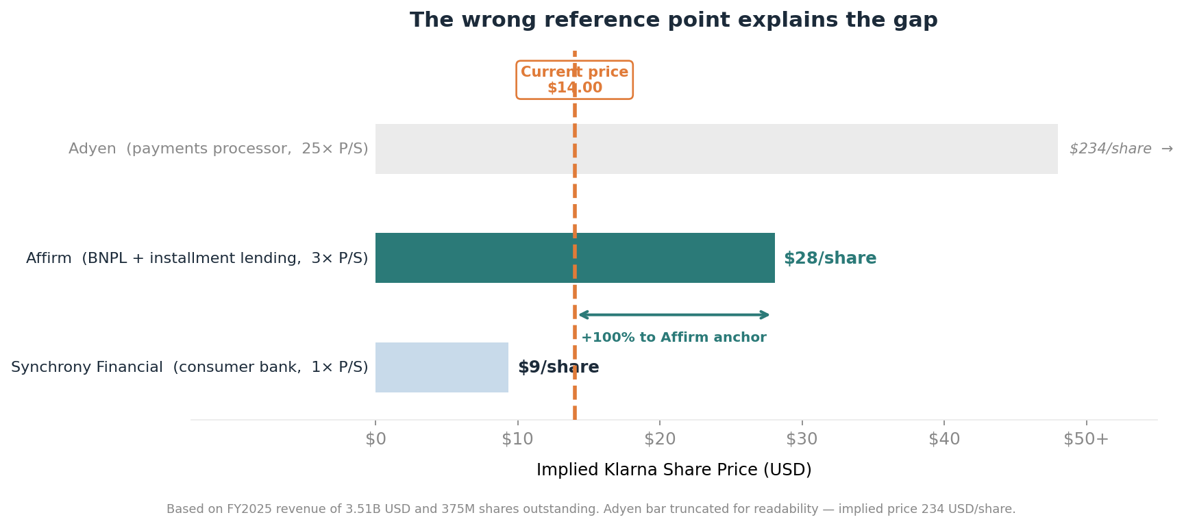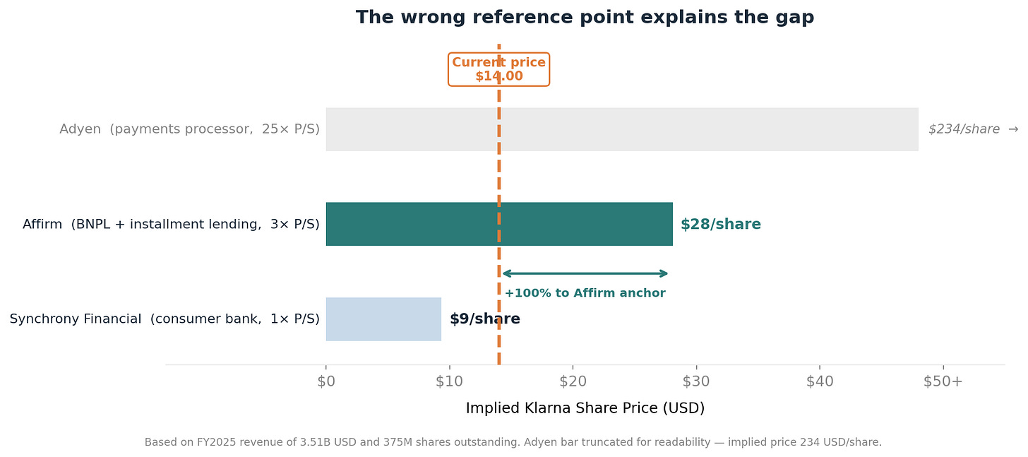 The opposite anchoring is equally wrong. Call Klarna a bank and you trigger Synchrony Financial, which trades at roughly 1 times revenue and manages a $100 billion consumer credit book with 30 years of US underwriting experience. Apply that multiple to Klarna and you get a $3.5 billion company. Roughly where it traded on the morning of February 21, 2026.