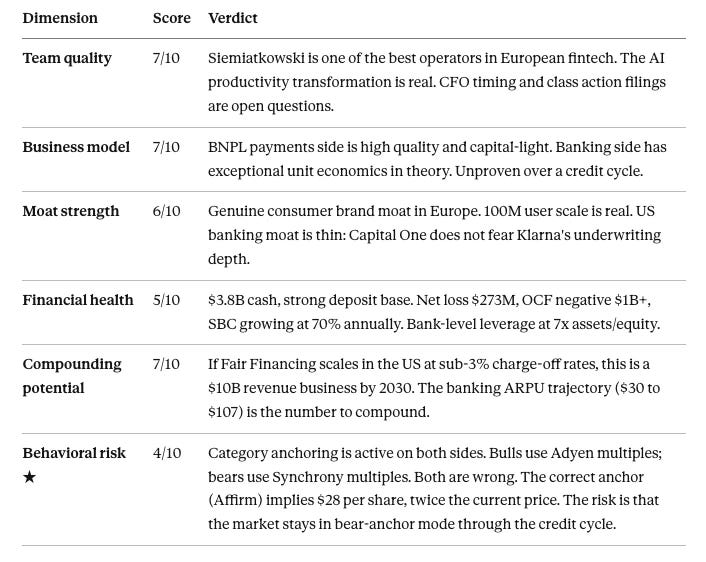 In the deals I have analyzed where businesses simultaneously occupy two value frameworks, part capital-light platform and part balance sheet lender, the market consistently misprices the compound entity until one cycle forces a reclassification. You saw the same dynamic play out with PayPal in the years after its spin from eBay, and with Square as it built Cash App on top of its payment rails. The reclassification is almost always painful for whoever was using the higher-multiple anchor. Klarna’s Q4 results were that reclassification moment. The question now is whether the market overshoots to the low-multiple anchor, which at $12.50 intraday on February 21 it may have done.