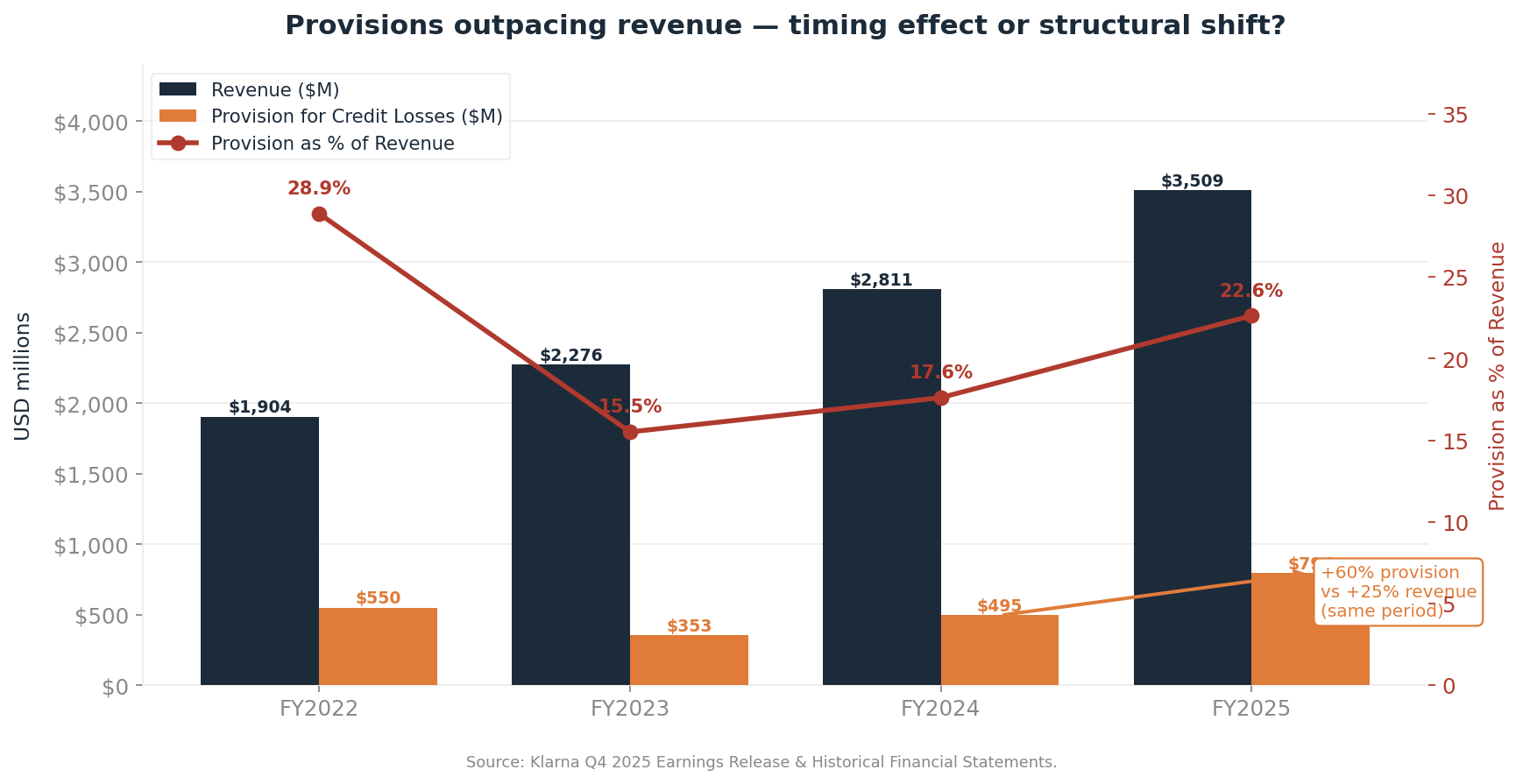 Think about that sentence for a moment. A company that grew Q4 revenue 38% year-over-year, to $1.08 billion, watched its stock hit an all-time low the same morning. The culprit was not fraud, not a product failure, not a competitive collapse. It was $250 million in provisions for credit losses. That number appeared in the income statement because Klarna is now, by any fair description, one of the largest consumer lenders in Europe with a fast-expanding US book.