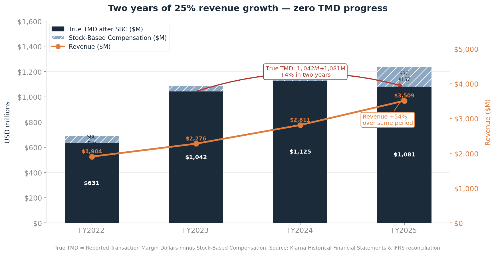 The number management is not foregrounding: true TMD after stock-based compensation. Reported TMD in 2025: $1.238 billion. SBC in 2025: $157 million, up from $92 million the prior year, a 70.7% increase. True TMD after SBC: $1.081 billion. That number has been essentially flat since 2023, when actual TMD was $1.085 billion. Two years of revenue growth at 25% per year, and the core operational metric, once you include the real cost of retaining talent through equity, has not moved.