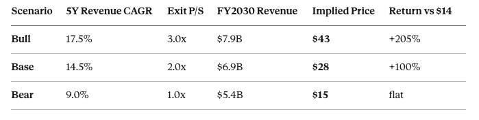 A reverse DCF from current price is instructive. At $14/share and 375 million shares outstanding, the market is effectively pricing in roughly 11.5% revenue CAGR over five years at a 1.5x exit P/S multiple — a scenario that already implies a share price of approximately $21. The market is pricing Klarna as if revenue growth stalls to near-bank levels while simultaneously applying a near-bank valuation. That combination requires both the bear anchor and the growth pessimism to be right at the same time.